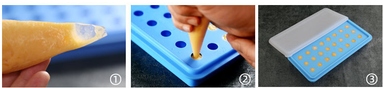 湯圓餡裝入裱花袋之后擠入模具,放進(jìn)冰箱凍硬后擠壓模具即可脫模。
