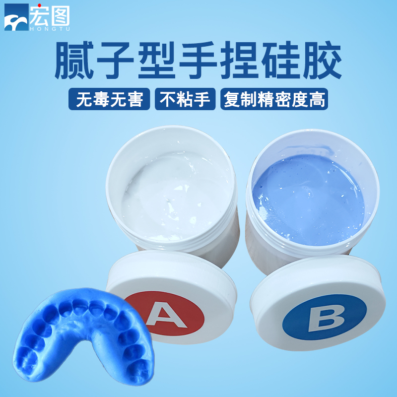 手捏硅膠是雙組份室溫固化硅橡膠,固化前A,B組分為膩子型(軟泥狀),混合后可快速固化,固化后具有一定的彈性和硬度,并且具有極低的成型收縮性和存儲穩(wěn)定性。利用其方便的可塑性可便捷地復(fù)制出所要空間的形態(tài),得到物體一定空間的仿制體,進(jìn)而可以測量所需部位的尺寸。對于那些難以用工具直接測量的所需部位,利用該材料能方便的完成測量。