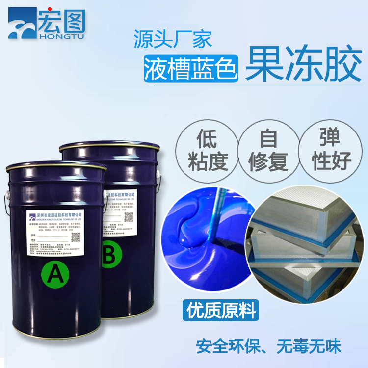 液槽膠也叫果凍膠、液槽果凍膠,是一種AB雙組份液體硅膠,A組分為透明液體,B組分為藍色(顏色是可以根據(jù)客戶需要進行調(diào)整的),安全環(huán)保,高韌性,固化后密封效果優(yōu)異。